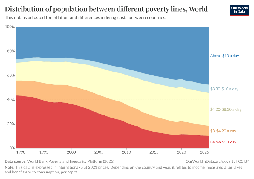 As we emphasize, the international poverty line is very low — well below what would be required to live a healthy and comfortable life. In the following chart, we also show data on the share (or you can switch to absolute numbers in the Settings using the “Display relative values” toggle) of the population living above or below higher poverty lines.