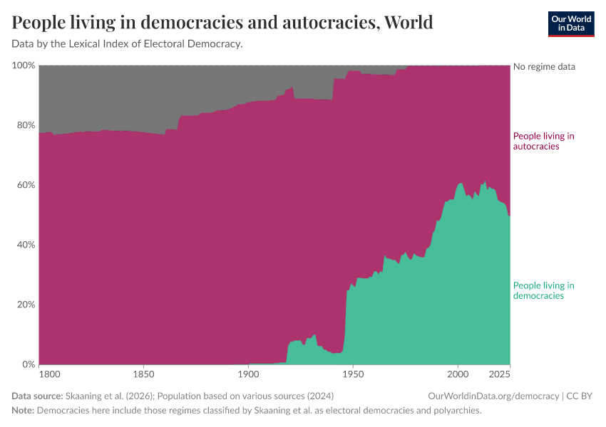 In the second half of the 20th century, the world changed significantly: Colonial empires ended, and more countries turned democratic. The share of the world population living in democracies increased from 25% in 1950 to 35% in 1980. Particularly important was the breakdown of the Soviet Union, which allowed more countries to democratize. It is worrying, however, that the share of people living in democracies has not increased in recent years.