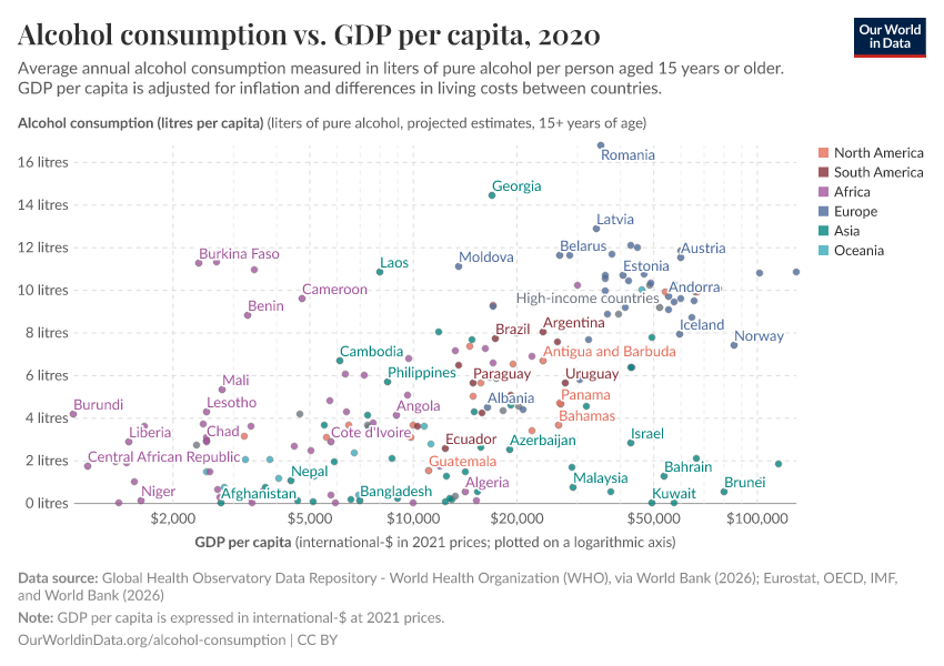 In the chart, we see the relationship between average per capita alcohol consumption – in liters of pure alcohol per year – versus gross domestic product (GDP) per capita across countries.