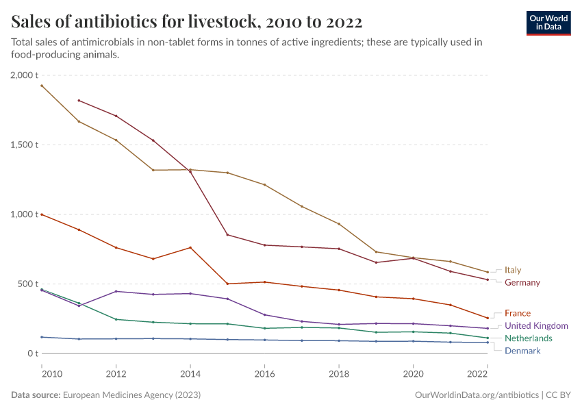Between 2011 and 2022, sales of veterinary antibiotics — measured in tonnes — fell by more than half.5 The use of antibiotics considered critically important in human medicine also fell by half, with some specific drugs falling by 80% to 90%.