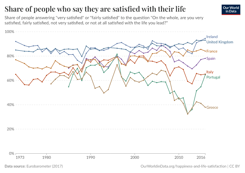 L'Eurobaromètre, sous l'égide de la Commission européenne, collecte depuis 1974 des données sur la satisfaction de vie au sein de grandes enquêtes d'opinion. Pour certains pays, ces enquêtes ont été menées annuellement depuis plus de 40 ans. Le graphique ci-dessous montre, comme précédemment, la part des personnes se disant “très satisfaites” ou “assez satisfaites” de leurs conditions de vie.