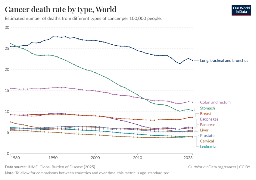 The chart below shows a historical view of reported cancer death rates since 1950 in the United States. You can see several major changes: colorectal and stomach cancer were previously the two most common cancer causes of death, but both have declined greatly over time.