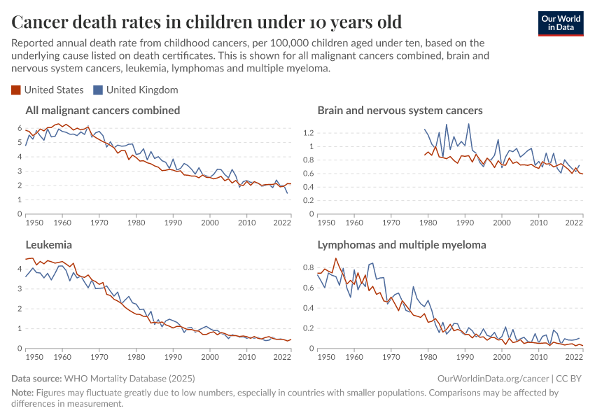 The chart below shows this. There have been declines in cancer death rates across age groups, but especially among children.