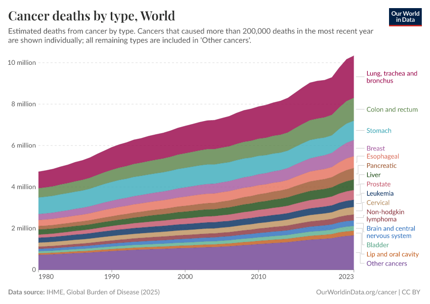 On this page, we explore global data and research on different types of cancer. This can help us better understand the risk factors for cancer, how cancer risks vary across the lifespan, how they differ worldwide, and how they have changed over time.