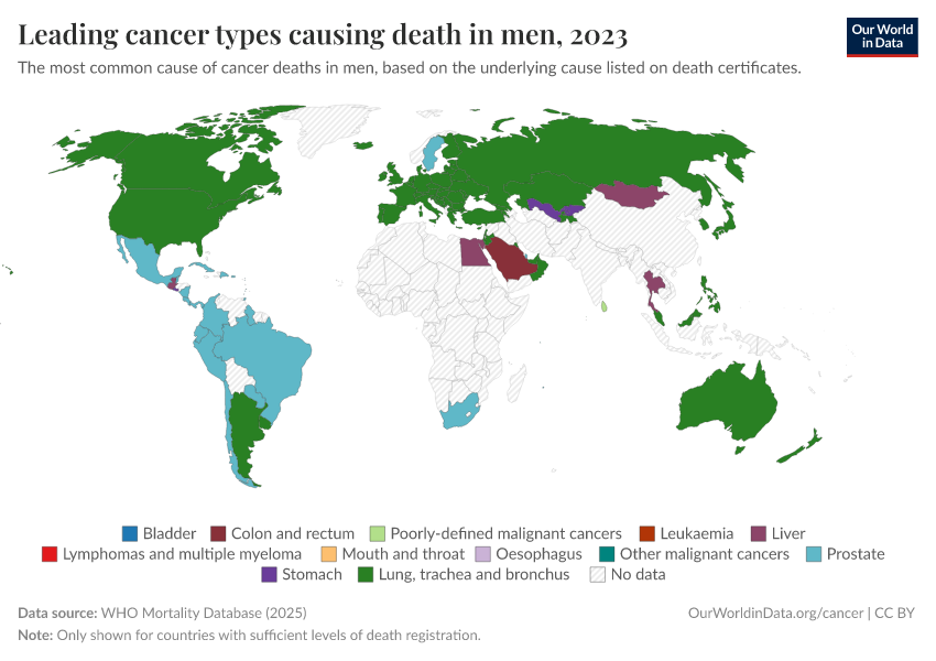 In men, you can see that lung cancer kills the most in many countries. Other cancers — such as prostate, liver, and stomach cancer — are the most common in others.
