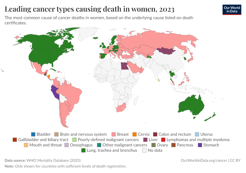 In women, the picture is different. Breast cancer is the most common cause of cancer death in women in many countries, but in others, lung, liver, and stomach cancer dominate.