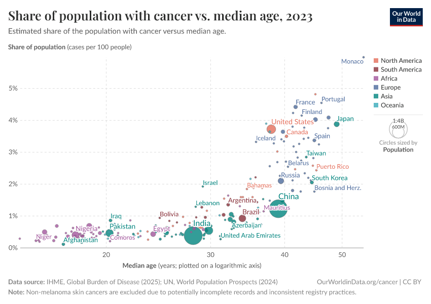 These factors mean that countries with older populations tend to have a higher prevalence of cancer. This is shown in the chart below.