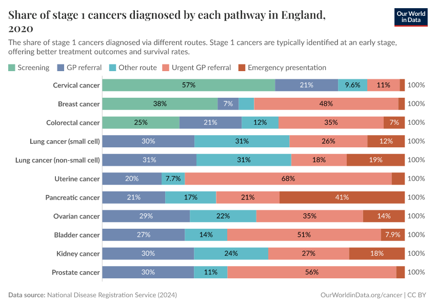 The chart below shows these pathways to diagnosis in England. As you can see, a significant share of stage 1 cases of cervical, breast, and colorectal cancer, are detected during screening in England. For others, most stage 1 cases are diagnosed during general practitioner (GP) referrals or other routes.