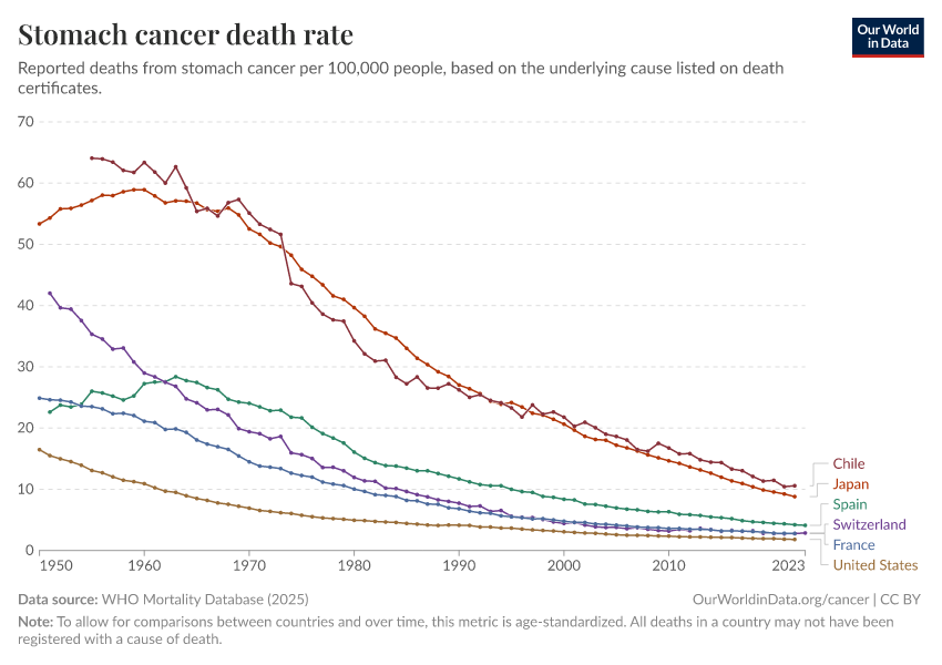 One notable example is stomach cancer, which used to be one of the top causes of cancer death in countries like the United States. But age-standardized death rates from stomach cancer have declined a lot over time, as the chart below shows.