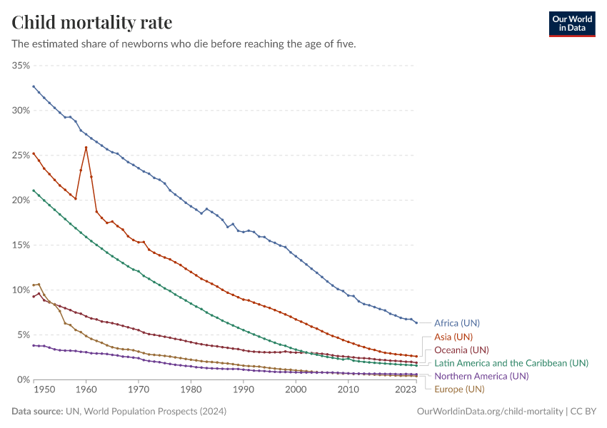 But 1950 was also a divided world. Child mortality rates across the rest of the world were still unimaginably high. With one-in-three children (sometimes higher) dying in their first few years, most parents across Africa, Asia and much of South America were probably still losing several children.