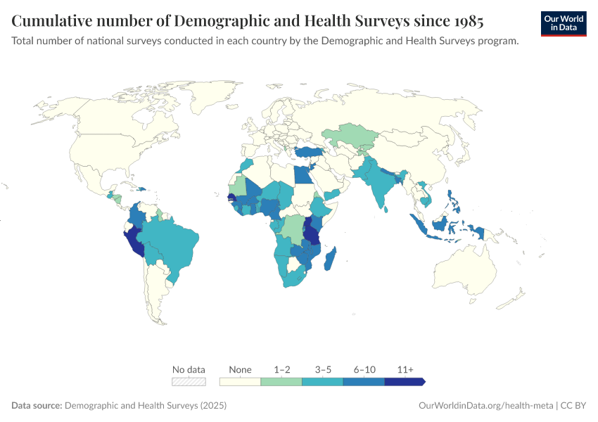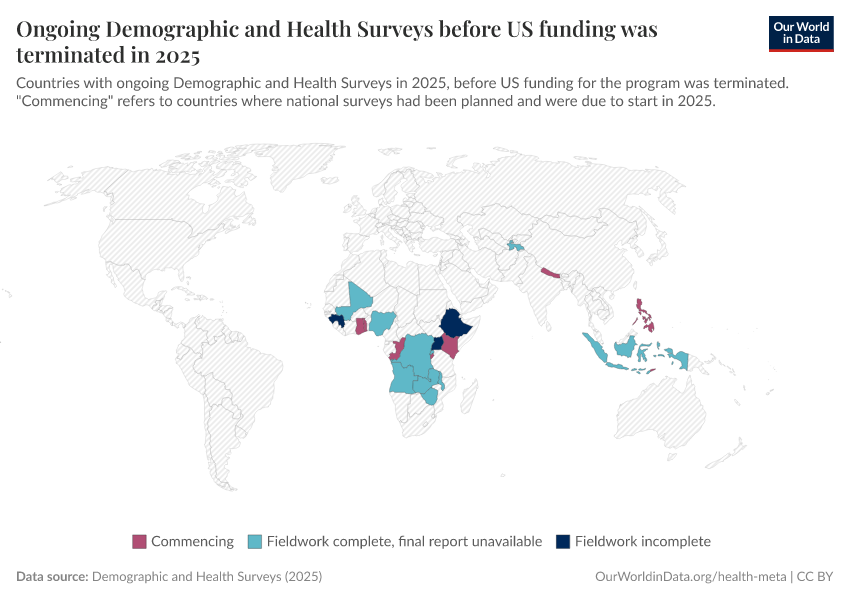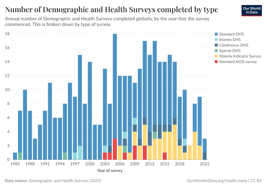 Saloni Dattani (2025) - “The Demographic and Health Surveys brought crucial data for more than 90 countries — without them, we risk darkness” Published online at OurWorldinData.org. Retrieved from: 'https://data-forest-share-update.owid.pages.dev:8789/20251216-063335/demographic-health-surveys-risk.html' [Online Resource] (archived on December 16, 2025).BibTeX citation