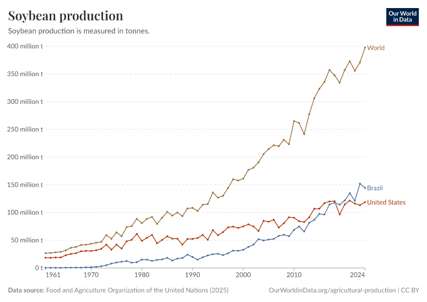 In the chart we see the change in soy production, yields, and area harvested. This tells us the percentage change in each of these variables relative to the first year shown. Here the starting year is 1961 but you can change this by adjusting the time slider at the bottom of the chart.