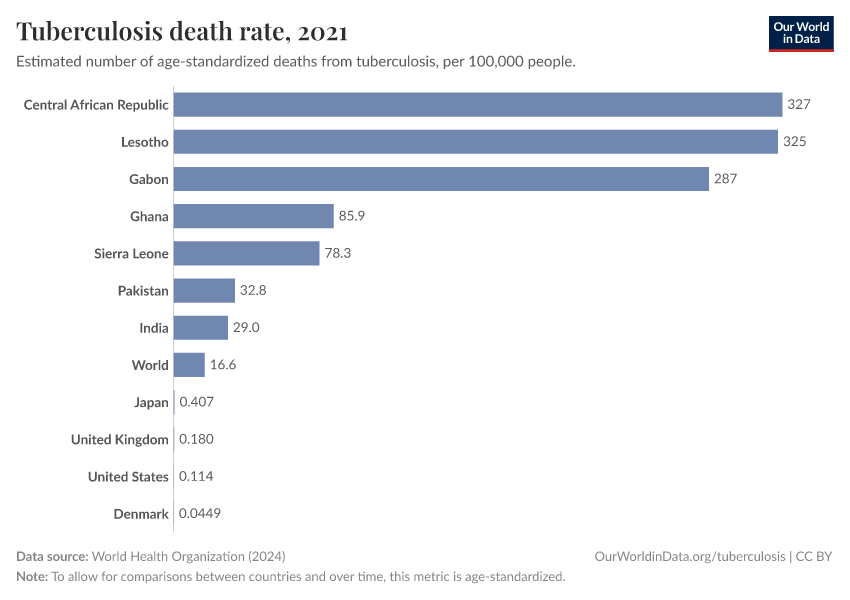Someone in Lesotho, the Central African Republic, or Gabon is at least 3,000 times more likely to die from TB than someone in the United States or Denmark. You can see these huge differences in death rates in the chart below.