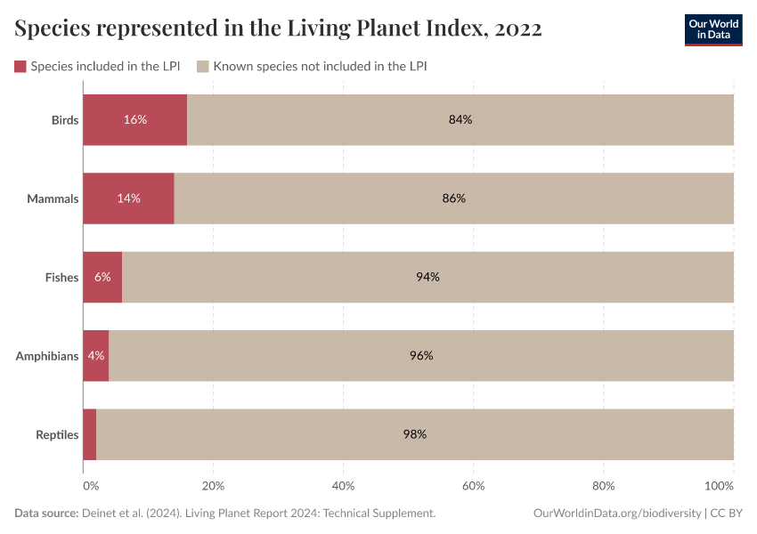 The LPI only includes data from vertebrate populations. This includes mammals, birds, reptiles, amphibians, and fish. Taxonomic groups including insects, corals, fungi, and plants are not included.