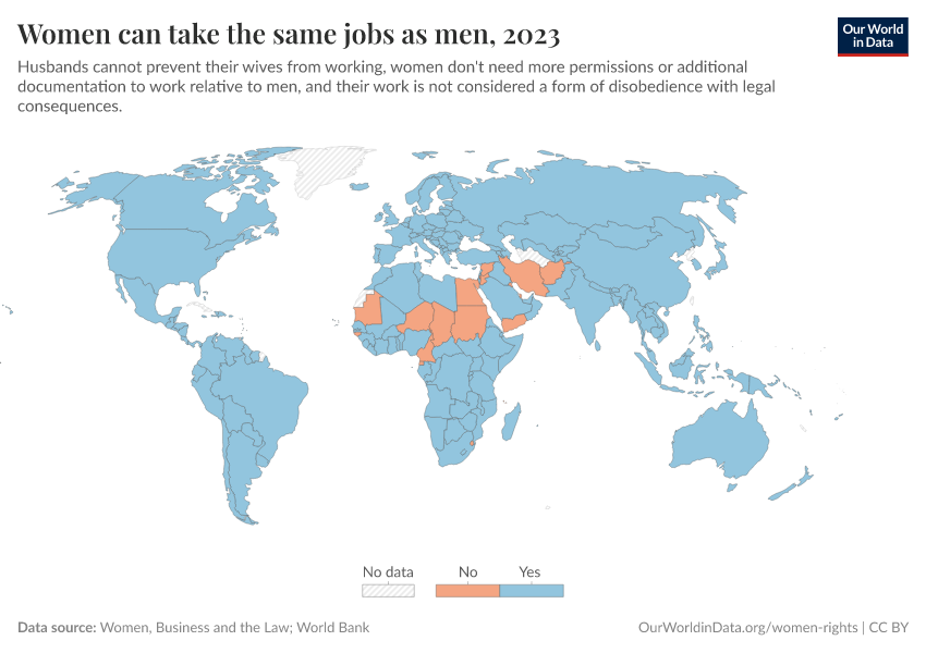 The map here shows that to this day, legal barriers to female labor force participation exist in parts of the world. The data in this map provides a measure of whether there are any specific jobs that women are not allowed to perform. So, for example, a country might be coded as "No" if women are only allowed to work in certain jobs within the mining industry, such as health care professionals within mines, but not as miners.