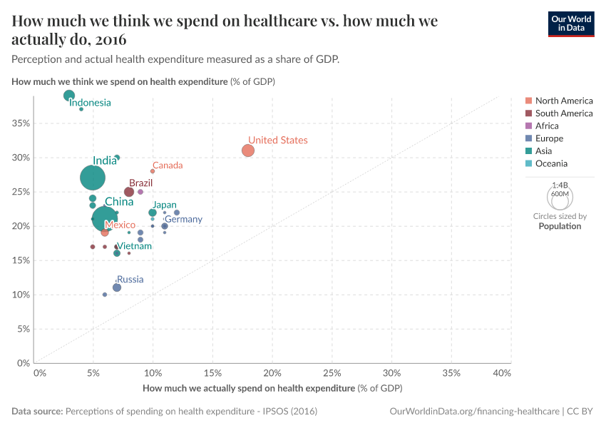 As we see, all countries included in the survey lie above a hypothetical parity diagonal (i.e. a line with slope one), meaning that people everywhere think they spend more on healthcare than they actually do. In those countries that lie closest to the parity diagonal, people have a more accurate perception of health spending.