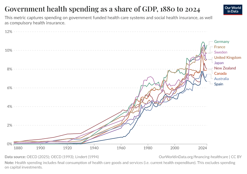 As the data show, in 1880 government health spending was below 1% of GDP in all countries; but this started changing quickly in the first half of the 20th century, and by 1970 government spending on healthcare was above 2% of GDP in all these countries.
