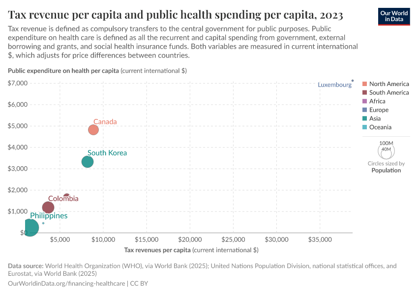 Esteban Ortiz-Ospina, Pablo Arriagada, and Max Roser (2017) - “Healthcare Spending” Published online at OurWorldinData.org. Retrieved from: 'https://data-forest-share-update.owid.pages.dev/financing-healthcare' [Online Resource]BibTeX citation
