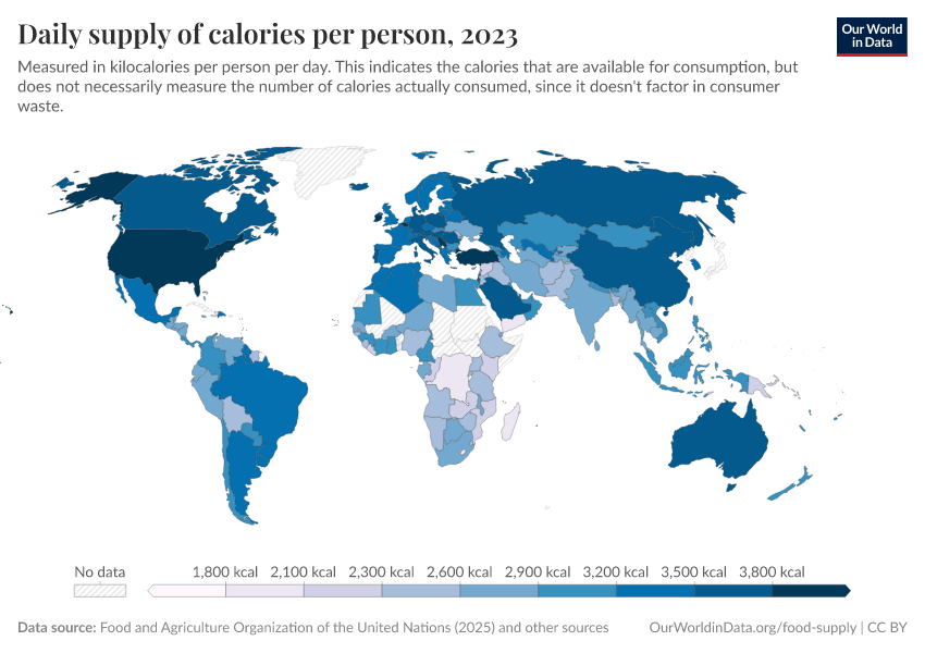 Max Roser, Hannah Ritchie, and Pablo Rosado (2013) - “Food Supply” Published online at OurWorldinData.org. Retrieved from: 'https://data-forest-share-update.owid.pages.dev/food-supply' [Online Resource]BibTeX citation
