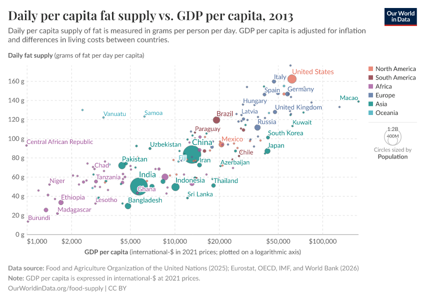 In this interactive map, we see the differences in how much fat each person gets every day in different countries.