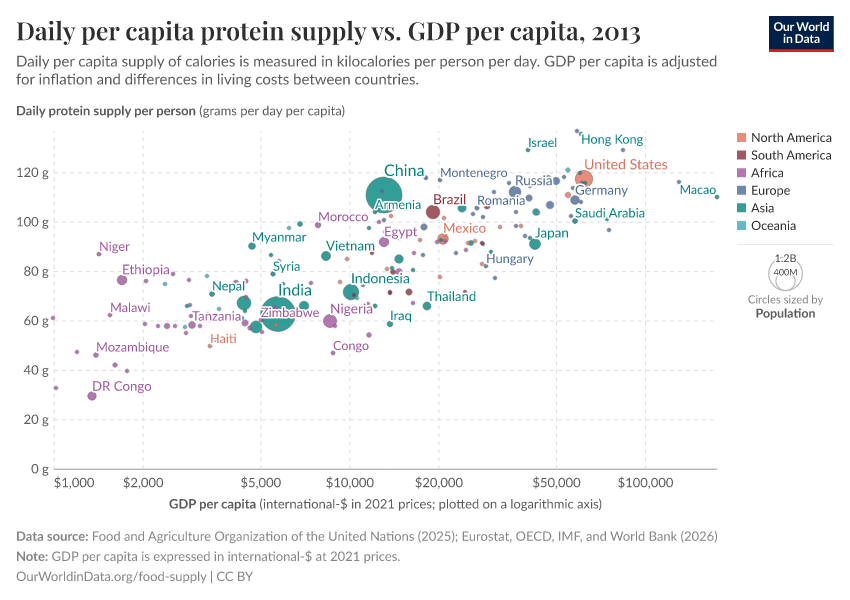 In the sub-sections below we have plotted the relationship between daily per capita food supply (in the form of calories, protein, and then fat) versus gross domestic product (GDP) per capita in 2011 international-$. Several countries selected across a range of income levels and global regions have been highlighted for comparison. For all three measures of food supply, we see a close correlation between per capita supply and prosperity. As we get richer, per capita supply tends to increase.