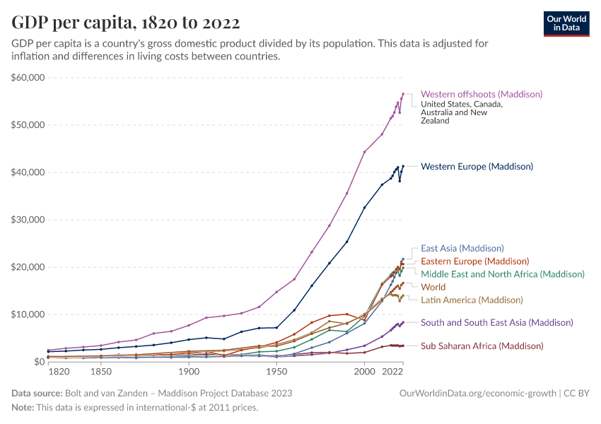 Since then, some countries have achieved very large growth — Swedes are, for example, about 30 times richer than two centuries ago — while other economies hardly grew at all. This unequal development resulted in the extremely large global inequality of today.