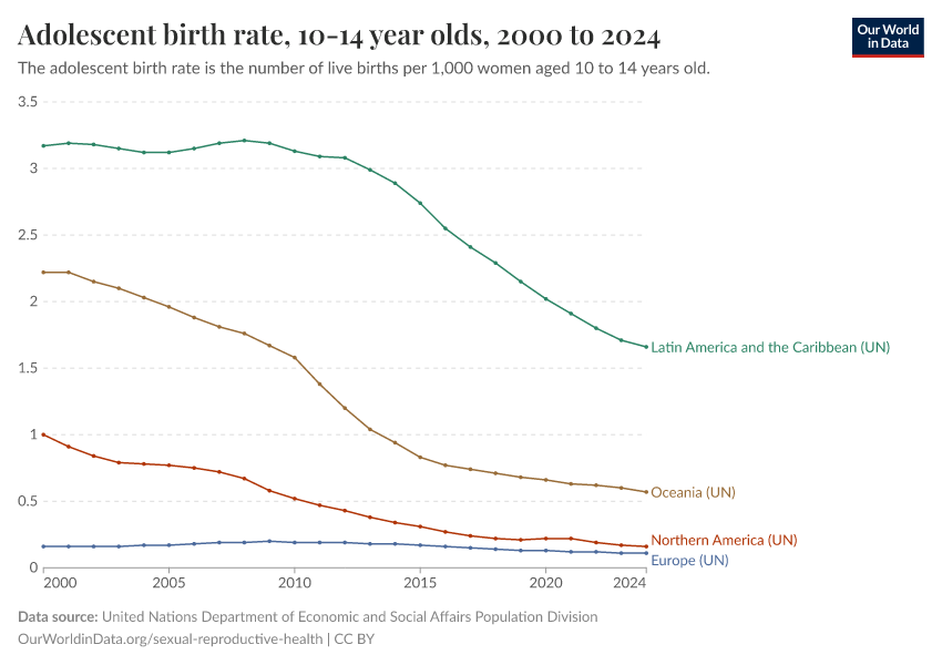 United Nations Department of Economic and Social Affairs Population Division – processed by Our World in Data. “Adolescent birth rate, 10-14 year olds” [dataset]. United Nations Department of Economic and Social Affairs Population Division, “Data from multiple sources” [original data]. Retrieved December 29, 2025 from https://data-forest-share-update.owid.pages.dev:8789/20251127-104454/grapher/adolescent-fertility.html (archived on November 27, 2025).