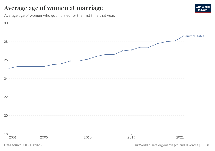 OECD (2025) – with minor processing by Our World in Data. “Average age of women at marriage” [dataset]. OECD, “OECD Family Database - Marriage and Divorce Rates” [original data]. Retrieved December 29, 2025 from https://data-forest-share-update.owid.pages.dev:8789/20251008-084854/grapher/age-at-marriage-women.html (archived on October 8, 2025).