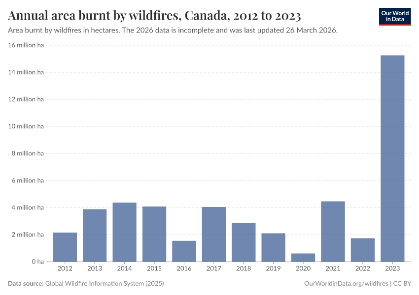 Global Wildfire Information System (2025); Global Wildfire Information System (2024) – with minor processing by Our World in Data. “Annual area burnt by wildfires” [dataset]. Global Wildfire Information System, “Seasonal wildfire trends” [original data]. Retrieved December 29, 2025 from https://data-forest-share-update.owid.pages.dev:8789/20251212-095432/grapher/annual-area-burnt-by-wildfires.html (archived on December 12, 2025).