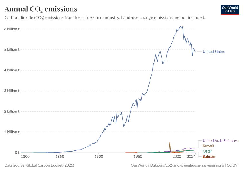 Global Carbon Budget (2025) – with major processing by Our World in Data. “Annual CO₂ emissions” [dataset]. Global Carbon Project, “Global Carbon Budget v15” [original data]. Retrieved December 29, 2025 from https://data-forest-share-update.owid.pages.dev:8789/20251204-133459/grapher/annual-co2-emissions-per-country.html (archived on December 4, 2025).