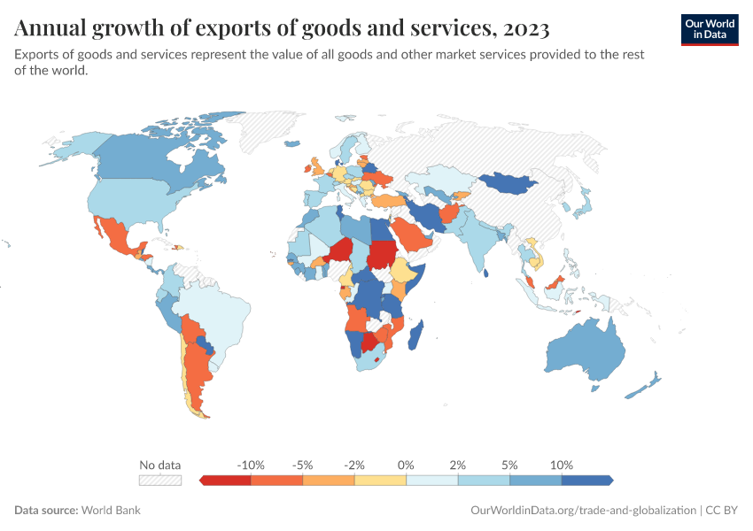 “Data Page: Annual growth of exports of goods and services”. Our World in Data (2025). Data adapted from World Bank. Retrieved from https://data-forest-share-update.owid.pages.dev:8789/20251125-165536/grapher/annual-growth-of-exports-of-goods-and-services.html [online resource] (archived on November 25, 2025).How to cite this data