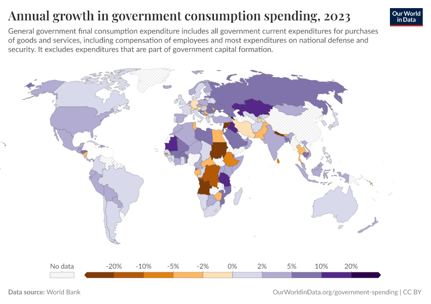 “Data Page: Annual growth in government consumption spending”. Our World in Data (2025). Data adapted from World Bank. Retrieved from https://data-forest-share-update.owid.pages.dev:8789/20251125-165536/grapher/annual-growth-of-general-government-final-consumption-expenditure.html [online resource] (archived on November 25, 2025).How to cite this data