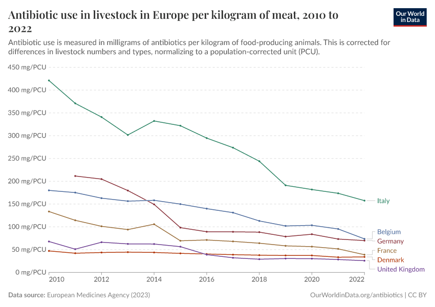 European Medicines Agency (2023) – processed by Our World in Data. “Antibiotic use in livestock in Europe per kilogram of meat” [dataset]. European Medicines Agency, “European database of sales of veterinary microbial agents (ESVAC) - population corrected units” [original data]. Retrieved December 29, 2025 from https://data-forest-share-update.owid.pages.dev:8789/20250909-093708/grapher/antibiotic-use-in-livestock-in-europe.html (archived on September 9, 2025).