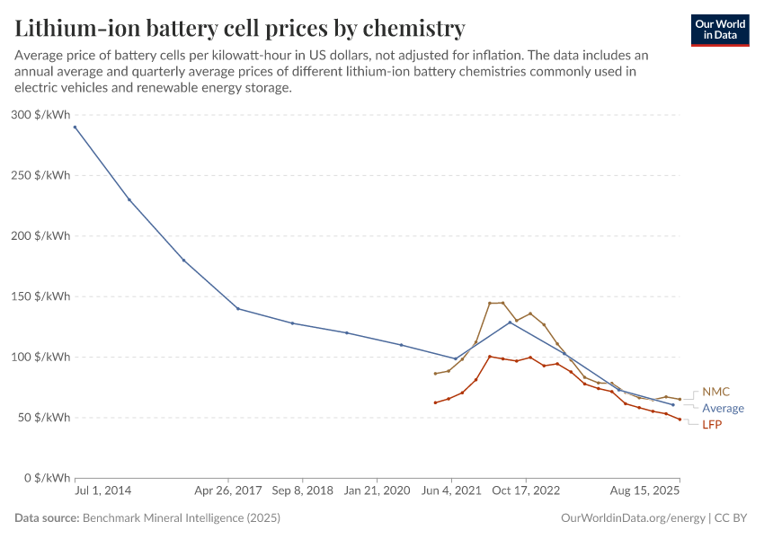 Benchmark Mineral Intelligence (2025) – with minor processing by Our World in Data. “Lithium-ion battery cell price” [dataset]. Benchmark Mineral Intelligence, “Lithium-ion battery prices”; Benchmark Mineral Intelligence, “Battery prices by chemistry” [original data]. Retrieved December 29, 2025 from https://data-forest-share-update.owid.pages.dev:8789/20251202-200328/grapher/average-battery-cell-price.html (archived on December 2, 2025).