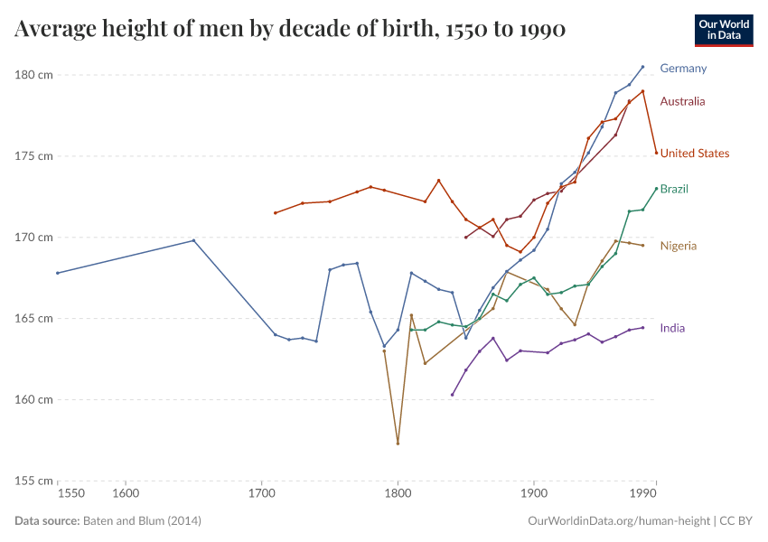 Baten and Blum (2014) – with minor processing by Our World in Data. “Average height of men by decade of birth” [dataset]. Baten and Blum, “Height” [original data]. Retrieved December 29, 2025 from https://data-forest-share-update.owid.pages.dev:8789/20250909-093708/grapher/average-height-of-men-for-selected-countries.html (archived on September 9, 2025).