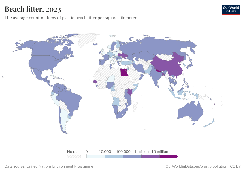 “Data Page: Beach litter”. Our World in Data (2025). Data adapted from United Nations Environment Programme. Retrieved from https://data-forest-share-update.owid.pages.dev:8789/20250909-093708/grapher/beach-litter.html [online resource] (archived on September 9, 2025).How to cite this data