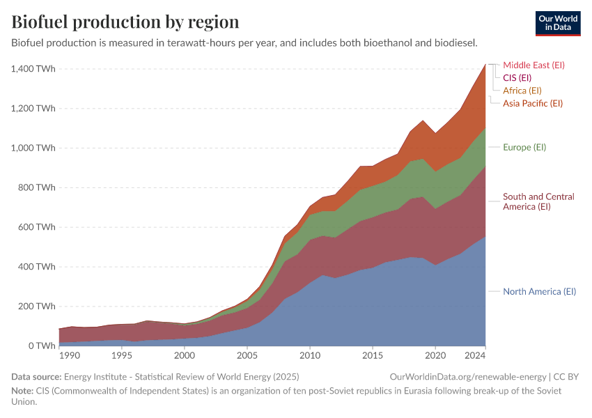 Energy Institute - Statistical Review of World Energy (2025) – with major processing by Our World in Data. “Biofuels production” [dataset]. Energy Institute, “Statistical Review of World Energy” [original data]. Retrieved December 29, 2025 from https://data-forest-share-update.owid.pages.dev:8789/20250909-093708/grapher/biofuels-production-by-region.html (archived on September 9, 2025).