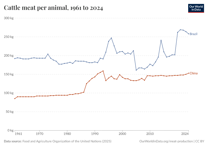 Food and Agriculture Organization of the United Nations (2025) – with major processing by Our World in Data. “Cattle meat yield per animal – UN FAO” [dataset]. Food and Agriculture Organization of the United Nations, “Production: Crops and livestock products” [original data]. Retrieved December 29, 2025 from https://data-forest-share-update.owid.pages.dev:8789/20251014-161652/grapher/cattle-meat-yields-hectograms-100-grams-per-animal.html (archived on October 14, 2025).