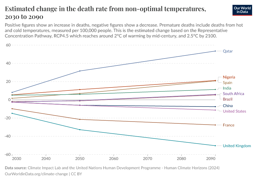 “Data Page: Estimated change in the death rate from non-optimal temperatures”. Our World in Data (2025). Data adapted from Climate Impact Lab and the United Nations Human Development Programme. Retrieved from https://data-forest-share-update.owid.pages.dev:8789/20250909-093708/grapher/change-heat-death-rate.html [online resource] (archived on September 9, 2025).How to cite this data