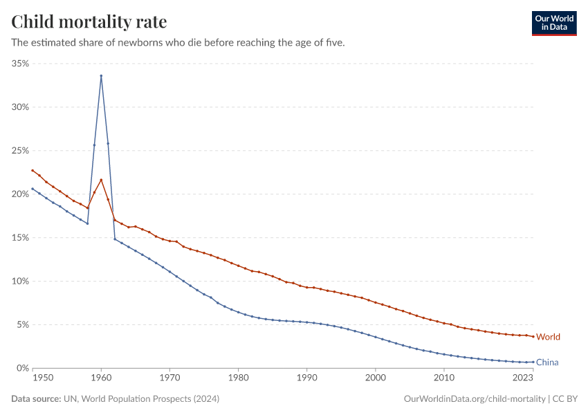 UN, World Population Prospects (2024) – processed by Our World in Data. “Child mortality rate, ages 0-4 – UN WPP” [dataset]. United Nations, “World Population Prospects” [original data]. Retrieved December 29, 2025 from https://data-forest-share-update.owid.pages.dev:8789/20250925-232706/grapher/child-mortality-around-the-world.html (archived on September 25, 2025).