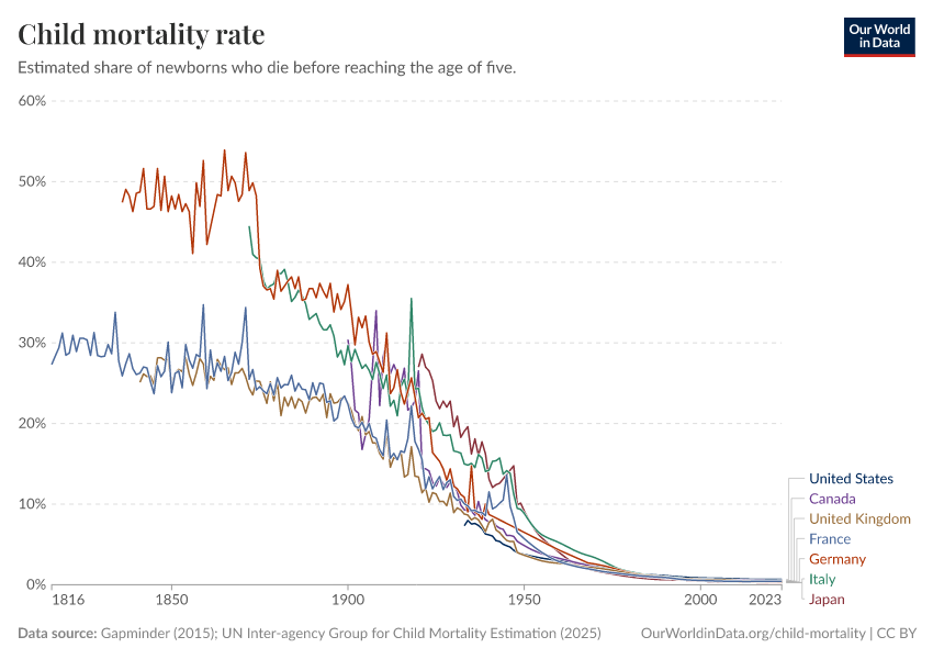 Gapminder (2015); UN Inter-agency Group for Child Mortality Estimation (2025) – processed by Our World in Data. “Child mortality rate – Gapminder; UN IGME – Long-run data” [dataset]. United Nations Inter-agency Group for Child Mortality Estimation, “United Nations Inter-agency Group for Child Mortality Estimation”; Gapminder, “Child mortality rate under age five v7”; Gapminder based on UN IGME & UN WPP, “Under-five Mortality v11”; Various sources, “Population” [original data]. Retrieved December 29, 2025 from https://data-forest-share-update.owid.pages.dev:8789/20251023-195030/grapher/child-mortality.html (archived on October 23, 2025).
