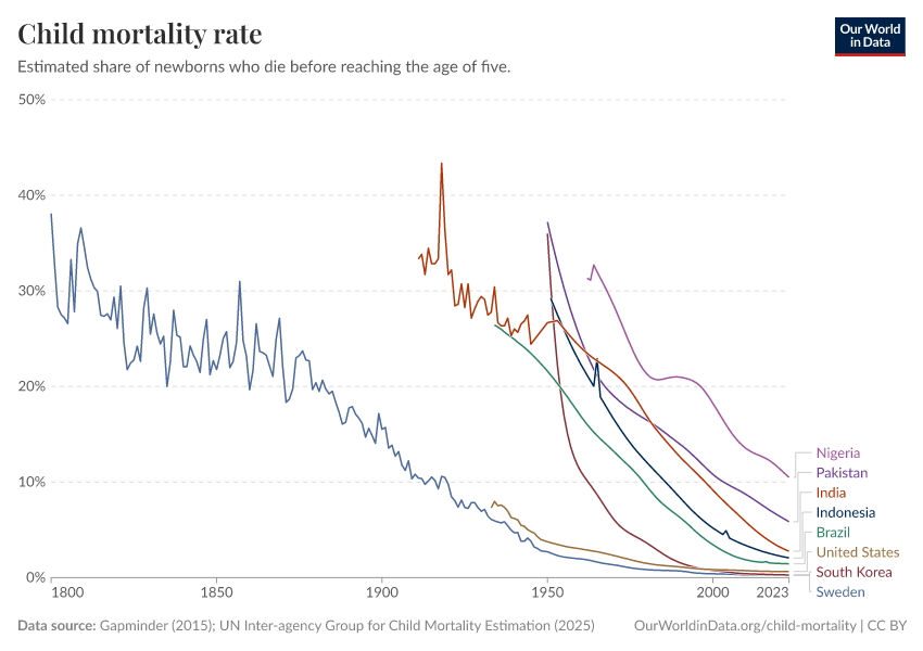 Gapminder (2015); UN Inter-agency Group for Child Mortality Estimation (2025) – processed by Our World in Data. “Child mortality rate – Gapminder; UN IGME – Long-run data” [dataset]. United Nations Inter-agency Group for Child Mortality Estimation, “United Nations Inter-agency Group for Child Mortality Estimation”; Gapminder, “Child mortality rate under age five v7”; Gapminder based on UN IGME & UN WPP, “Under-five Mortality v11”; Various sources, “Population” [original data]. Retrieved December 29, 2025 from https://data-forest-share-update.owid.pages.dev:8789/20251023-195030/grapher/child-mortality.html (archived on October 23, 2025).