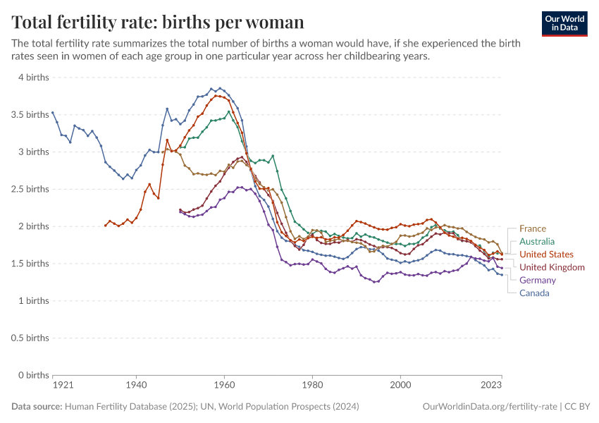 “Data Page: Fertility rate: births per woman”, part of the following publication: Saloni Dattani, Lucas Rodés-Guirao, and Max Roser (2025) - “Fertility Rate”. Data adapted from Human Fertility Database, United Nations. Retrieved from https://data-forest-share-update.owid.pages.dev:8789/20251022-230420/grapher/children-born-per-woman.html [online resource] (archived on October 22, 2025).