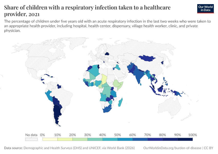 “Data Page: Share of children with a respiratory infection taken to a healthcare provider ”. Our World in Data (2025). Data adapted from Demographic and Health Surveys (DHS) and UNICEF, via World Bank. Retrieved from https://data-forest-share-update.owid.pages.dev:8789/20250916-102301/grapher/children-treated-ari.html [online resource] (archived on September 16, 2025).How to cite this data