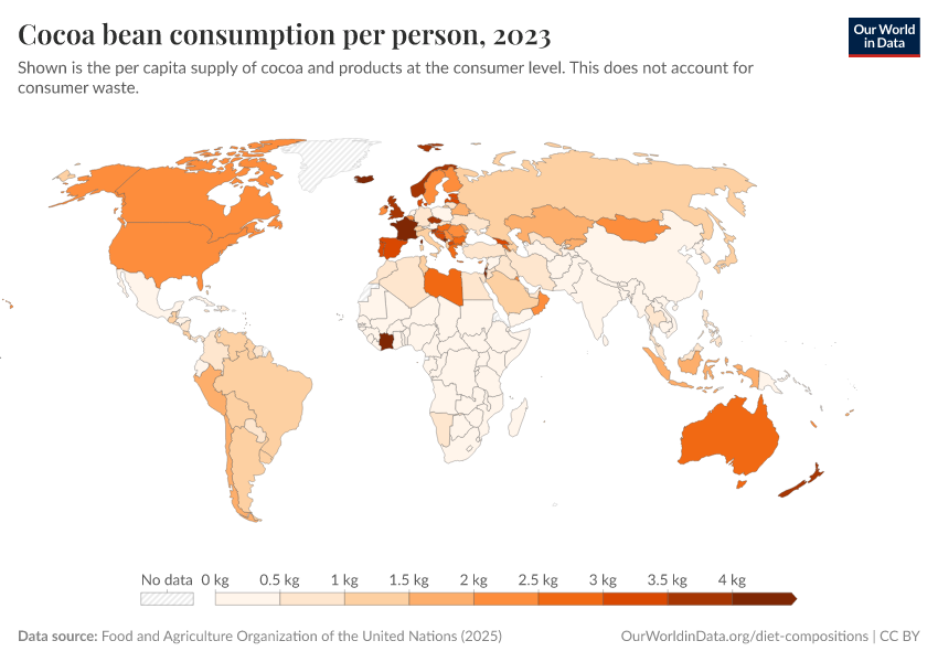“Data Page: Yearly per capita supply of cocoa beans”. Our World in Data (2025). Data adapted from Food and Agriculture Organization of the United Nations. Retrieved from https://data-forest-share-update.owid.pages.dev:8789/20251128-120039/grapher/chocolate-consumption-per-person.html [online resource] (archived on November 28, 2025).How to cite this data