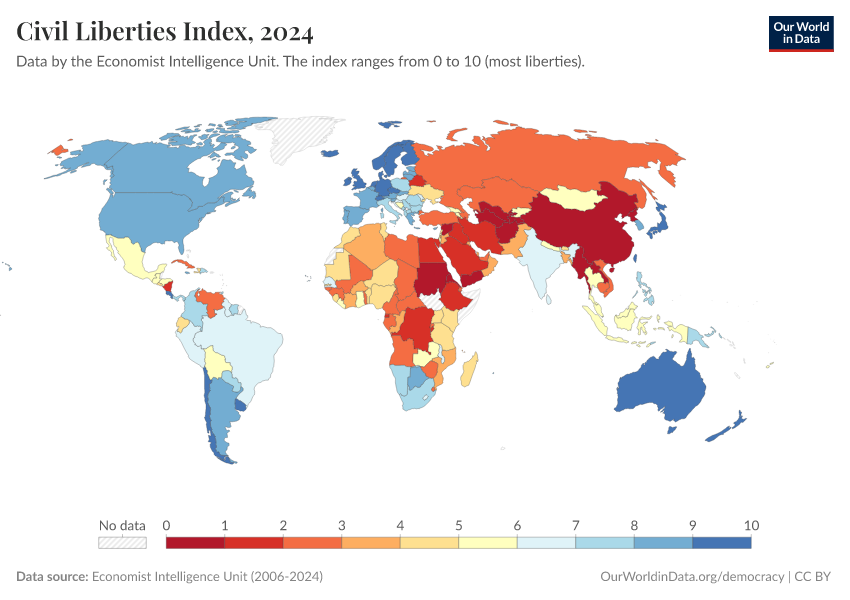 Economist Intelligence Unit (2006-2024) – processed by Our World in Data. “Civil Liberties Index” [dataset]. Economist Intelligence Unit, “Democracy Index 2021: The China challenge”; Economist Intelligence Unit, “Democracy Index 2022: Frontline democracy and the battle for Ukraine”; Economist Intelligence Unit, “Democracy Index 2023: Age of Conflict”; Economist Intelligence Unit, “Democracy Index 2024: What's wrong with representative democracy?”; Gapminder, “Democracy Index v4”; Various sources, “Population” [original data]. Retrieved December 29, 2025 from https://data-forest-share-update.owid.pages.dev:8789/20251209-133038/grapher/civil-liberties-index-eiu.html (archived on December 9, 2025).