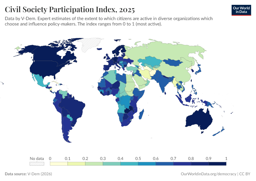 “Data Page: Civil society participation index”, part of the following publication: Bastian Herre, Lucas Rodés-Guirao, and Esteban Ortiz-Ospina (2013) - “Democracy”. Data adapted from V-Dem. Retrieved from https://data-forest-share-update.owid.pages.dev:8789/20251209-133038/grapher/civil-society-participation-index.html [online resource] (archived on December 9, 2025).How to cite this data