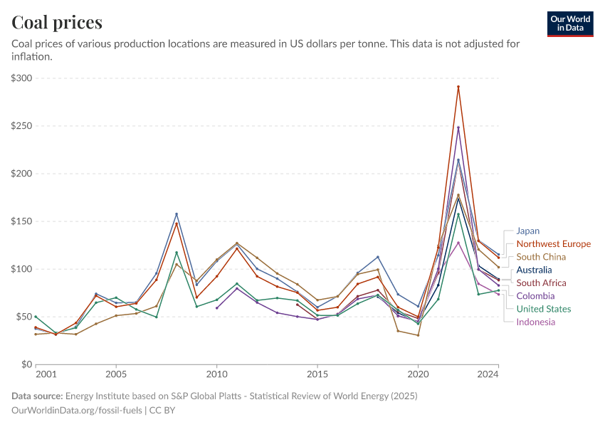 Energy Institute based on S&P Global Platts - Statistical Review of World Energy (2025) – with major processing by Our World in Data. “Coal prices” [dataset]. Energy Institute, “Statistical Review of World Energy” [original data]. Retrieved December 29, 2025 from https://data-forest-share-update.owid.pages.dev:8789/20250909-093708/grapher/coal-prices.html (archived on September 9, 2025).