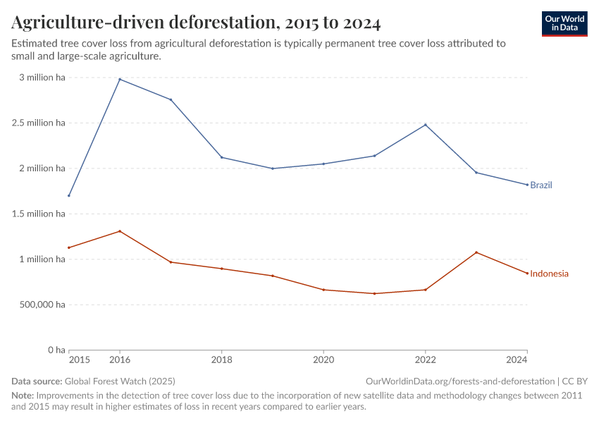 Global Forest Watch (2025) – with major processing by Our World in Data. “Agriculture-driven deforestation” [dataset]. Global Forest Watch, “Tree Cover Loss by Dominant Driver” [original data]. Retrieved December 29, 2025 from https://data-forest-share-update.owid.pages.dev:8789/20250909-093708/grapher/commodity-driven-deforestation.html (archived on September 9, 2025).