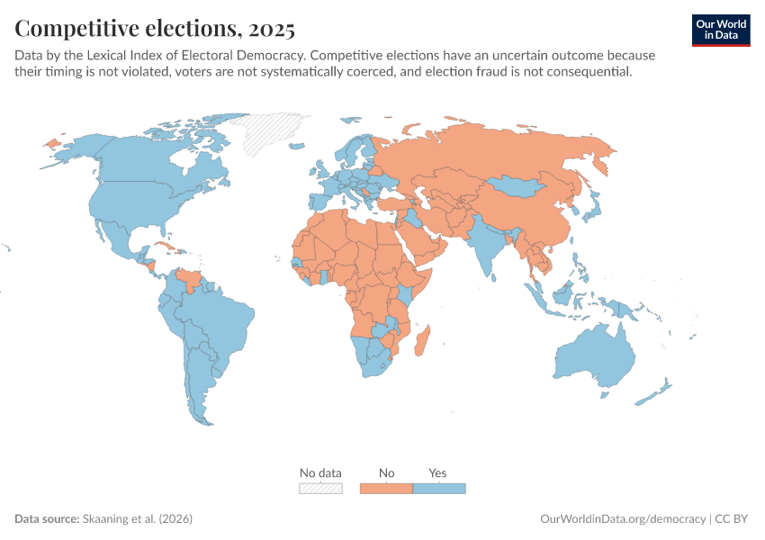 Skaaning et al. (2025) – processed by Our World in Data. “Competitive elections” [dataset]. Skaaning et al., “Lexical Index of Electoral Democracy (LIED) v6.8” [original data]. Retrieved December 29, 2025 from https://data-forest-share-update.owid.pages.dev:8789/20250909-093708/grapher/competitive-elections-lexical.html (archived on September 9, 2025).